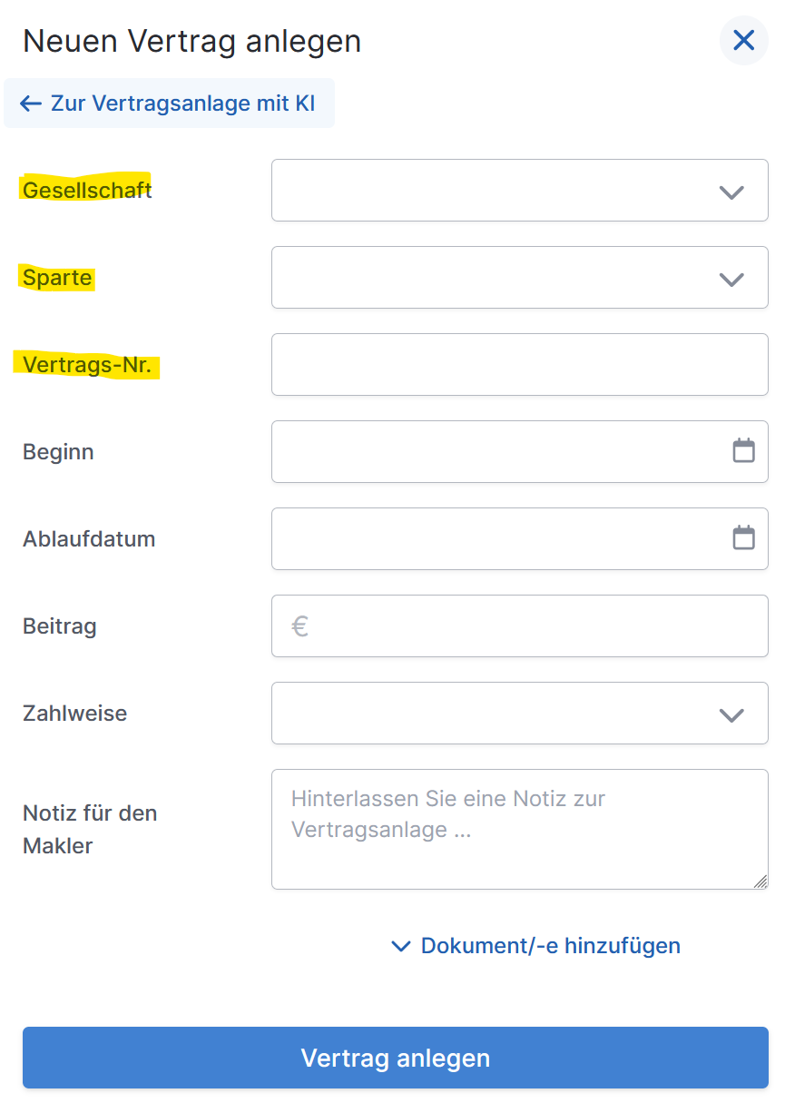 Legen Sie unter „Vertrag anlegen“ mit wenigen Klicks selbst Ihre bestehenden Verträge übersichtlich an (ggf. nach Freischaltung).