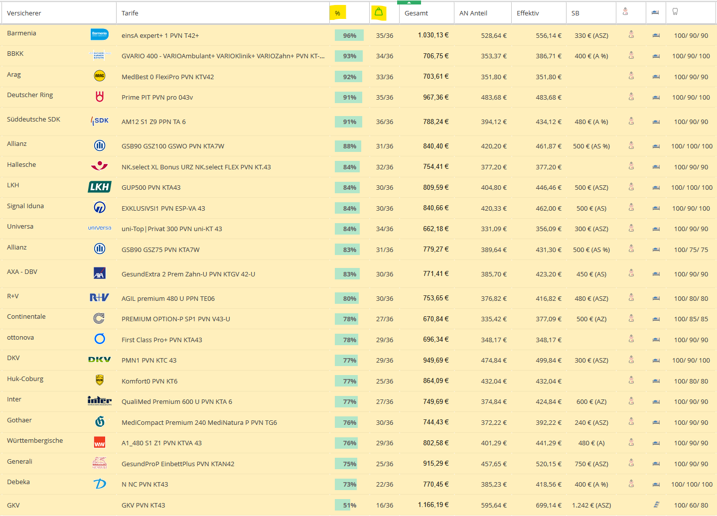 Im nächsten Schritt entscheidet der Kunde, welche Auswahl von Anbietern und Tarifen er sich genauer anschauen möchte. Da fällt die Debeka schon häufig raus, da ihre Tarifbedingungen wie oben beschrieben eine Reihe von Schwächen aufweisen.